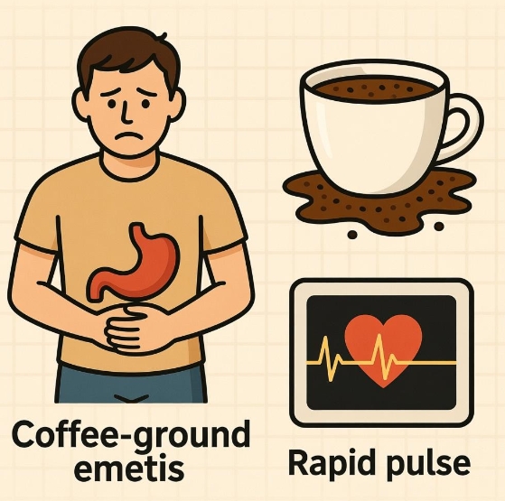 • Hematemesis: vomiting fresh red blood or clots indicates active, usually arterial, bleeding; when gastric acid mixes with blood for minutes the appearance becomes “coffee-ground.”