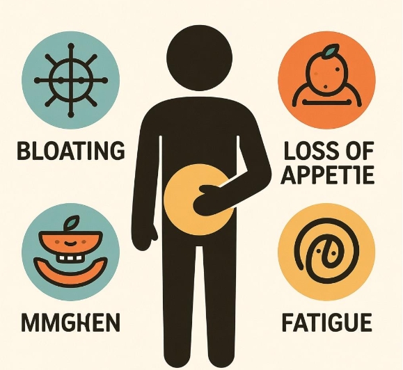 Bloating & early satietySense of fullness, visible lower-abdominal swellLarge meals, activity; improved by rest