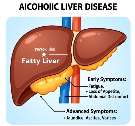 Alcoholic liver disease (ALD) is a spectrum of liver injury caused by long-term excessive alcohol consumption. It progresses from simple steatosis to alcoholic hepatitis, fibrosis, and ultimately cirrhosis. Symptoms vary depending on the stage of liver damage.