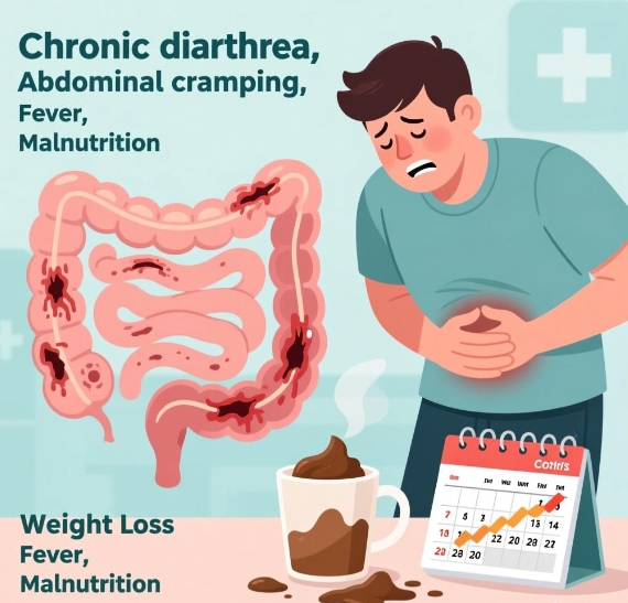Patients typically report cramping abdominal pain, most often localized to the lower quadrants. Diarrhea is nearly universal: stools may be watery, contain mucus, or be overtly bloody; frequency can range from a few episodes to more than twenty per day. Urgency and tenesmus are common, and nocturnal bowel movements frequently disrupt sleep. Rectal bleeding, sometimes occult, can lead to fatigue, pallor, and iron-deficiency anemia. Weight loss, low-grade fever, and anorexia develop when inflammation is extensive or persistent. Extraintestinal manifestations—such as joint pain, mouth ulcers, or skin lesions—may accompany active disease .