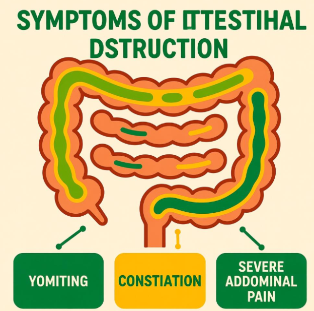 Abdominal pain: forceful peristalsis in the proximal bowel causes colicky pain every 5–15 min; persistent severe pain suggests ischemia or perforation.