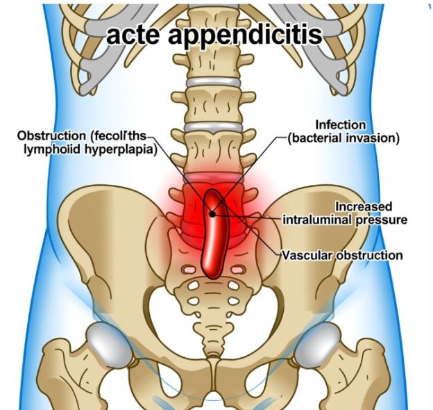 Acute appendicitis results from luminal obstruction followed by bacterial overgrowth and rapid inflammation. Cardinal features in chronological order are: