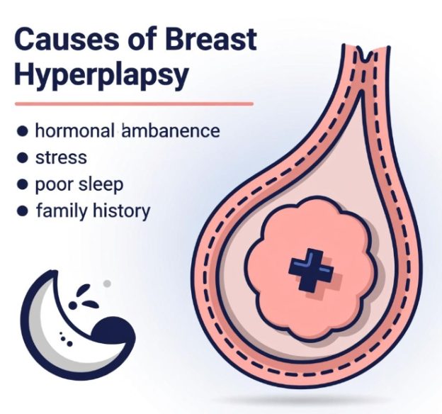Mammary hyperplasia (fibrocystic change or benign proliferative breast disease) encompasses a spectrum of hormonally responsive stromal and epithelial alterations. Symptoms fluctuate with the menstrual cycle and often regress spontaneously; however, pronounced changes require exclusion of malignancy.
