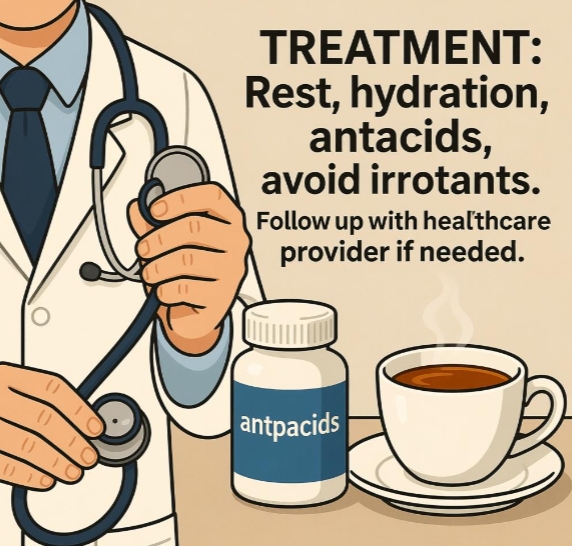 | Management | Remove triggers (alcohol, NSAIDs, irritating foods), dietary adjustments, medication, rest |