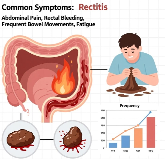 Proctitis is inflammation confined to the distal 12–15 cm of the rectum. It may be acute or chronic, infectious, inflammatory, radiation-induced, or ischemic. Because the rectum serves as the final stool reservoir, even limited mucosal irritation produces prominent local symptoms that patients notice immediately and often attribute mistakenly to hemorrhoids.
