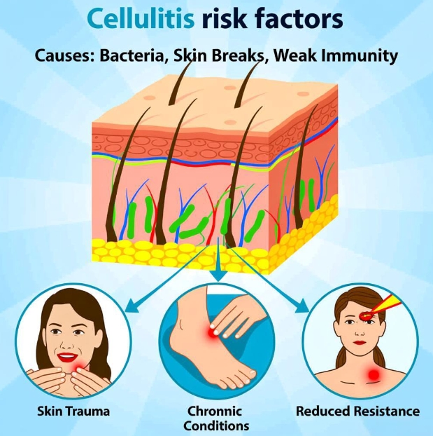 Cellulitis is an acute bacterial infection of the dermis and subcutaneous tissue, most often caused by Staphylococcus aureus or Streptococcus pyogenes. It usually begins at a site of minor trauma and spreads rapidly; systemic involvement may follow if treatment is delayed.