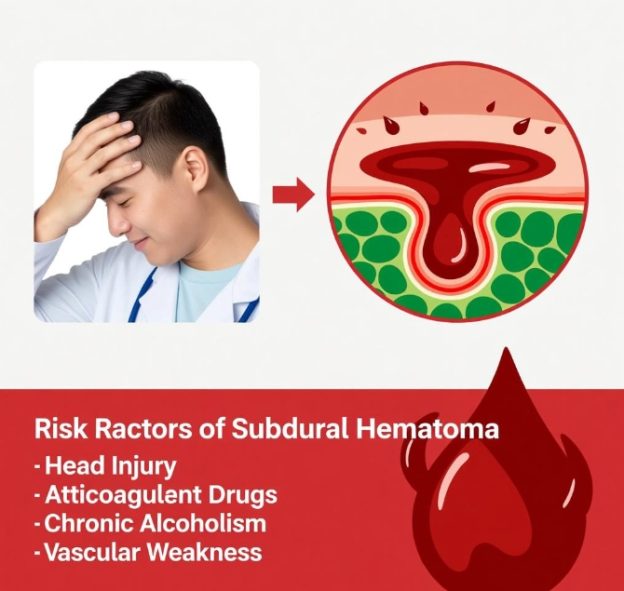 Subdural hematoma (SDH) is bleeding between the dura and the arachnoid. Symptoms depend on how fast blood accumulates, the size of the clot, and the patient’s age or brain atrophy. They may appear within minutes (acute), days (sub-acute) or weeks (chronic).